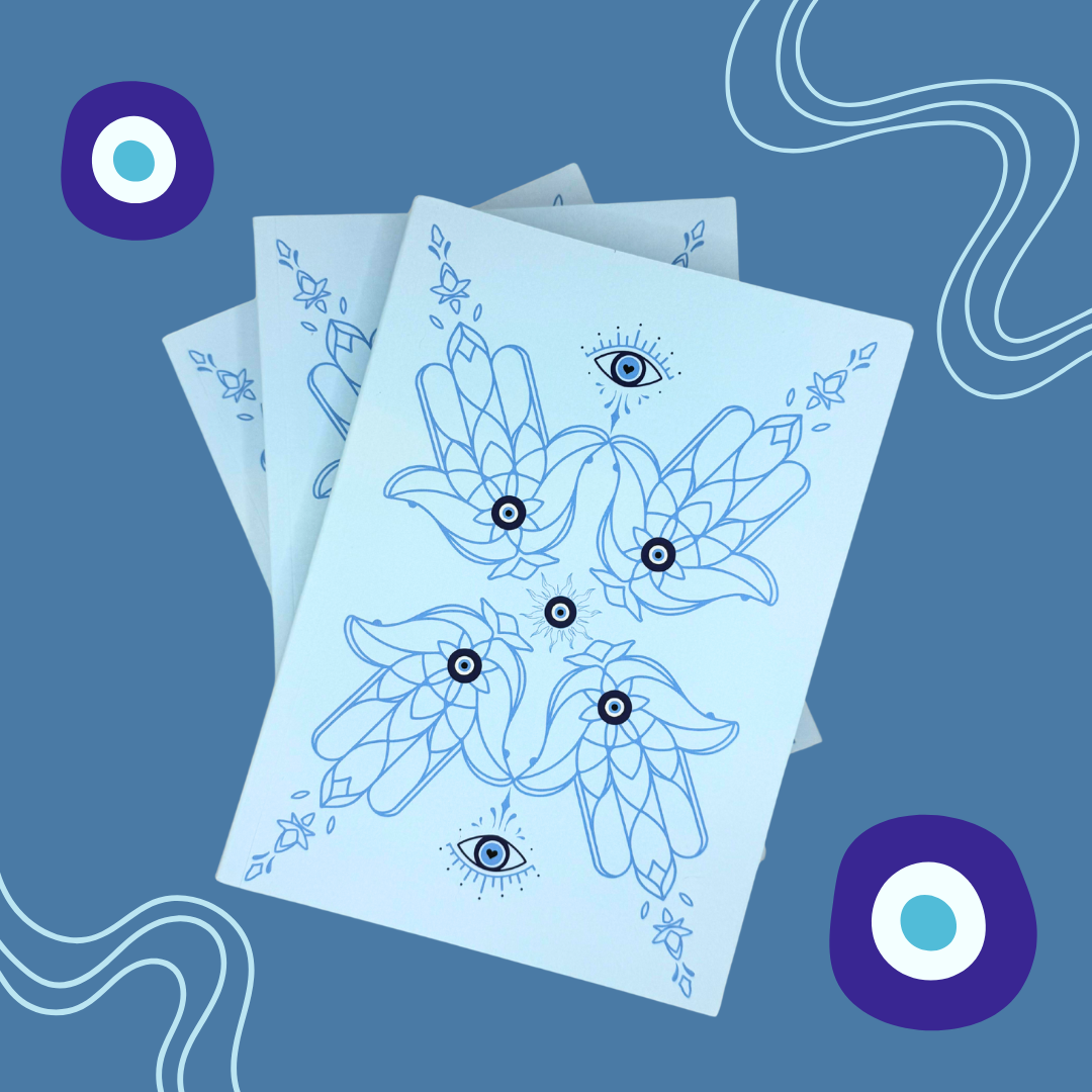 This soft blue cover pairs winged symmetry with watchful eyes, symbolising balance, peace, and higher awareness. A visual mantra that gently reminds you to look within and beyond, with grace.